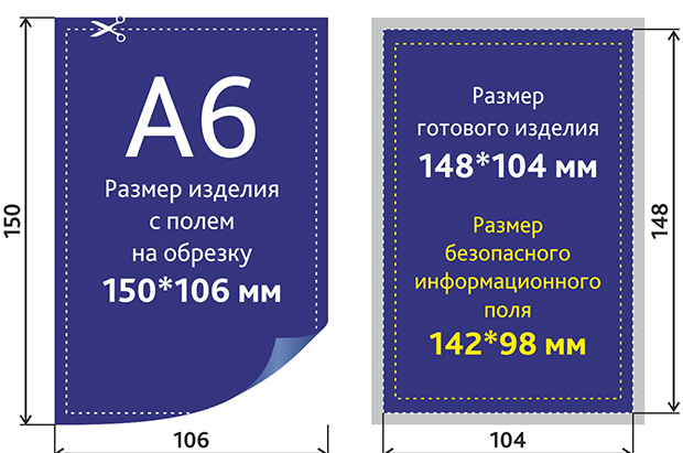 Размер листовки с припусками на обрез 150x106 мм (т.е. по 1 мм с каждого края);